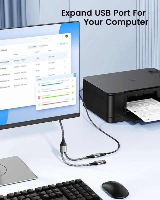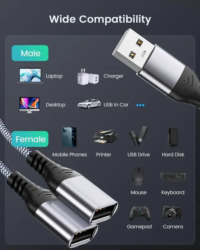 This dual usb splitter allows for power to be taken from 2 USB ports, such as a PC, external hard drive, intermittent, keyboard, audio The USB Y splitter cable is commonly used in USB 2.0 device, just plug and play, easy to use