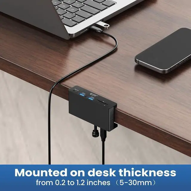 • Innovation Design-No More Sliding: Adajustable Clamp Hub,Replace traditional USB Hub which with the disadvantages of sliding everywhere,hard to plug and unplug and take up space,the new design Hub can fit the thickness from 0.2 to 1.2 inches (5-30mm)extended the USB fuction from host to desk, install the hub where you need at a convenient place,enjoy the stable data transmission more easier and no need to squat down the table to connect every device