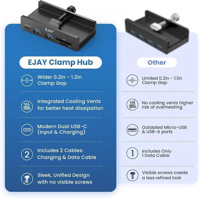 Innovation Design-No More Sliding: Adajustable Clamp Hub, Replace traditional USB Hub which with the disadvantages of sliding everywhere, hard to plug and unplug and take up space, the new design Hub can fit the thickness from 0.2 to 1.2 inches (5-30mm)extended the USB fuction from host to desk, install the hub where you need at a convenient place, enjoy the stable data transmission more easier and no need to squat down the table to connect every device