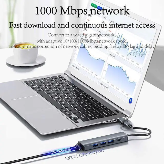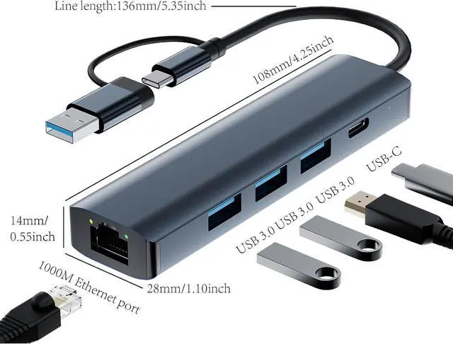 5 in 2 Ports ExpansionGet 3*USB 3.0, USB-C, 1000M Gigabit Ethernet RJ45 port, all in one hub.