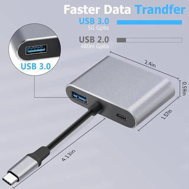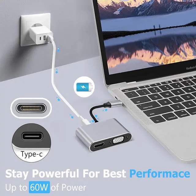 SUPER SPEED DATA TRANSFER USB 3.0 PORT & TYPE-C FAST CHARGING PORT - The transmission speed of 4 IN 1 HDTV VGA to USB C/TYPE C Adapter can rate up to 5Gbps (5120Mbps), transfer large filles, videos and other data in seconds. The USB-C port can support 100W PD max charging for your Type-C laptops/tablets/smart phone and other Type-C devices.