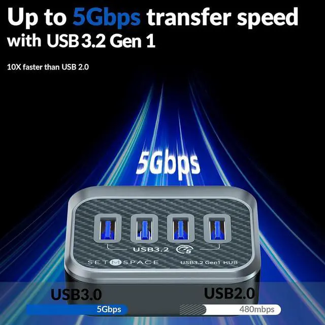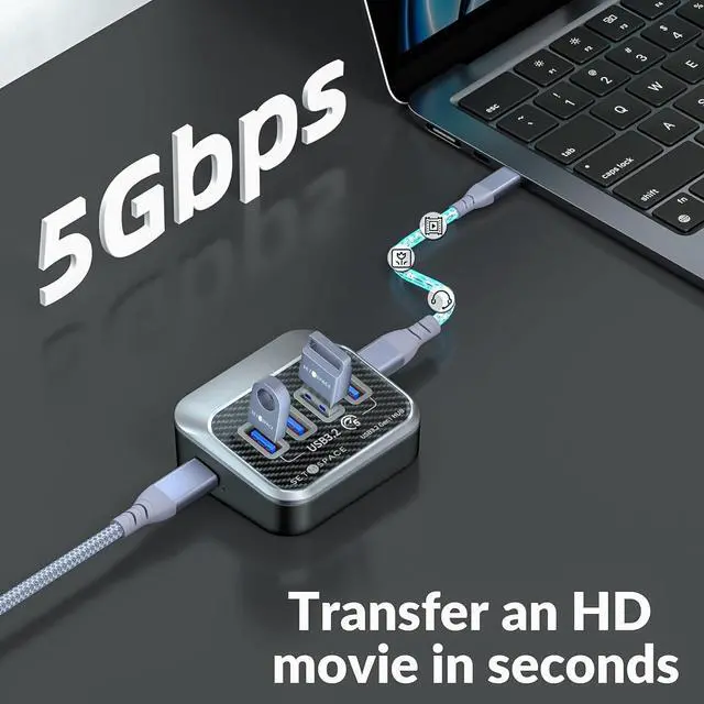 Lightning-Fast Data TransferThis 4 port USB HUB syncs data at up to 5Gbps, which is more than 10 times faster than USB 2.0, fast enough to transfer an HD movie in seconds. You could get the joy of life faster than others now