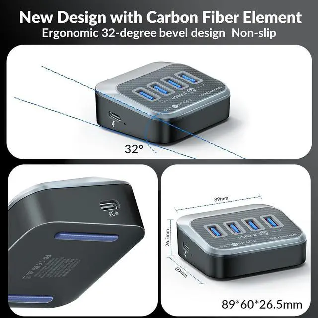 Innovative 32° Slope DesignOur unique slope design of 4 port USB C Port makes it easy to plug and unplug your devices, while also protecting your USB sockets from damage.