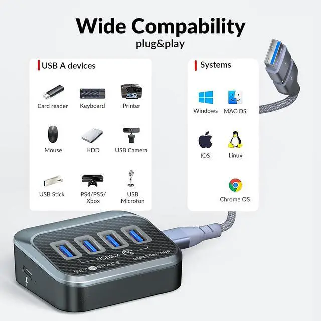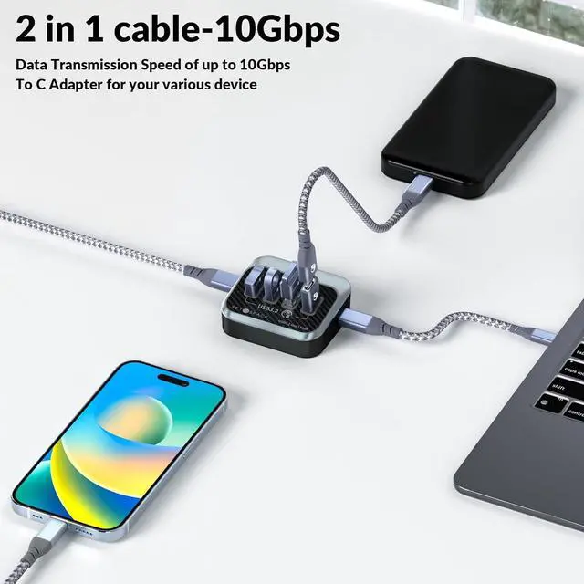 2-in-1 Cable for Multiple DevicesOur USB hub comes with a 2-in-1 cable (C to C/A) that connects to a variety of devices, including USB C phone, Samsung Galaxy, IPad, Tablet, One Plus, Laptop, and more.