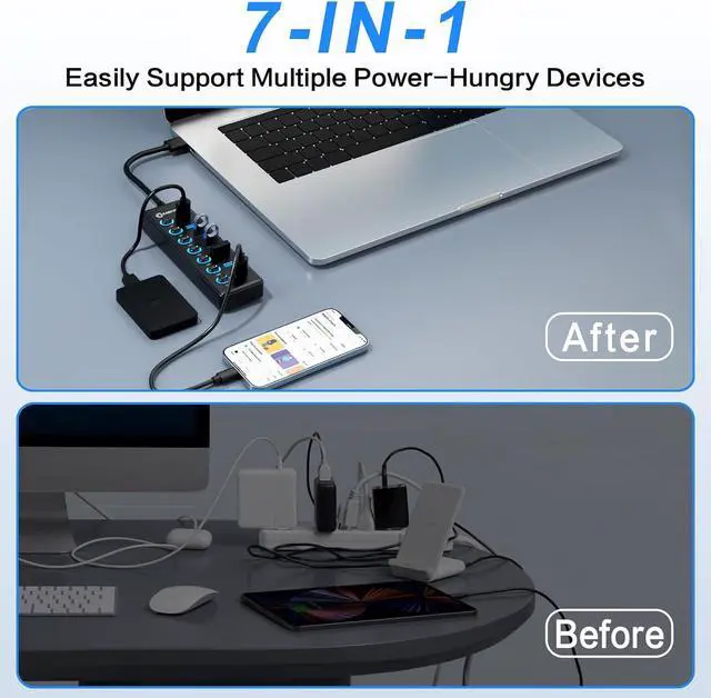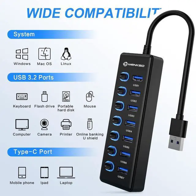 Hub: Instantly expands 1 USB port into 7 external USB 3.0 data ports for connecting keyboards, mice, printers, hard drives, USB flash drives and other USB devices. Say goodbye to computer jacks and slow data transfer. It is also backward compatible with older USB 2.0 / 1.0 devices.