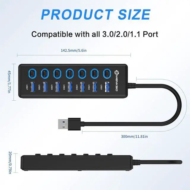 Individual Switch: The MENKSID Powered USB Hub is designed with an individual switch, so you can turn it on or off at any time without unplugging the device. In addition, each port has an LED light, so you can easily check the power status.