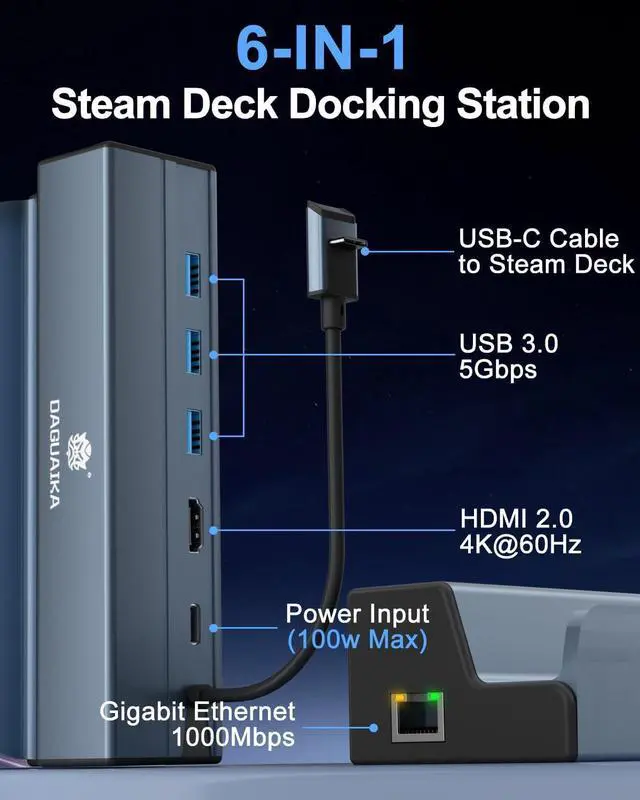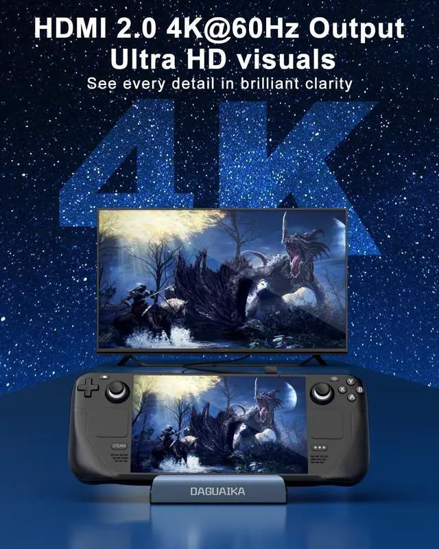 [Ultra HD 4K HDMI Display] - The Steam Deck Dock comes with a 4K@60Hz HDMI 2.0 output. When you connect an external 4K monitor, it can provide you sharper and smoother visual experience, so you can enjoy the visual feast on your games