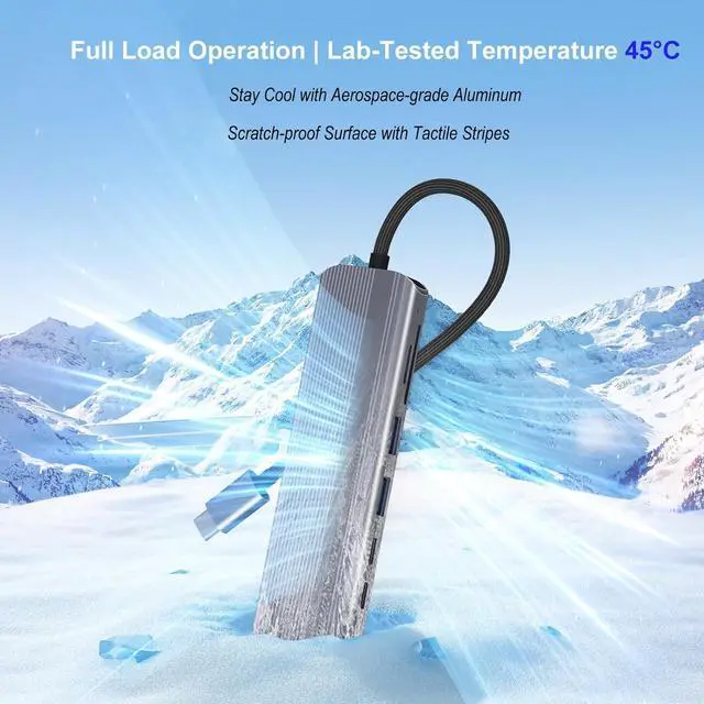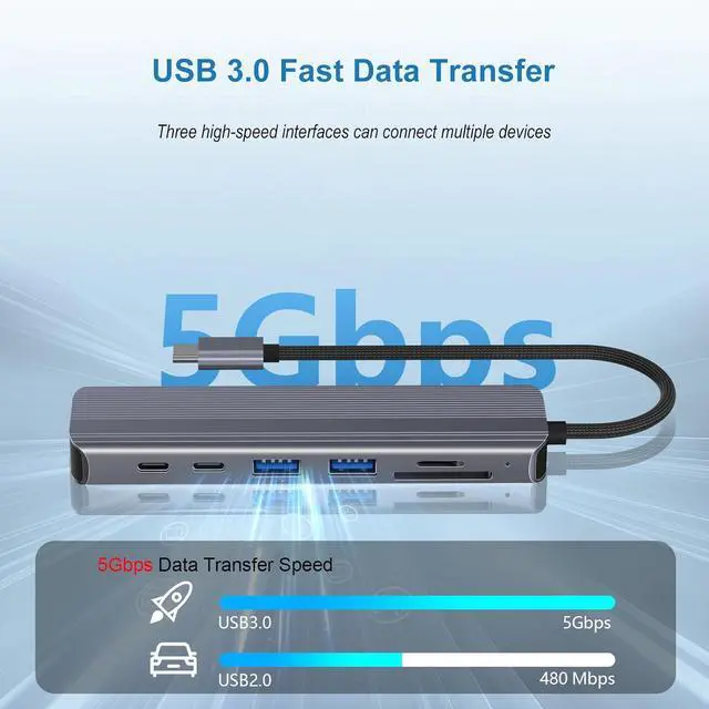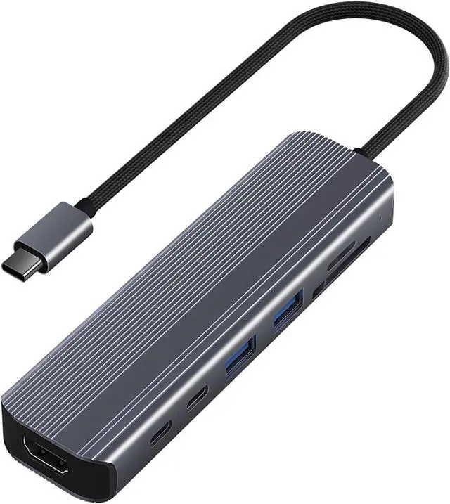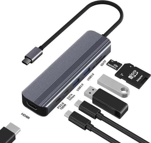 VERSATILE CONNECTIVITY: 7-in-1 USB-C hub featuring HDMI output, 100W PD charging, USB-A ports, SD/TF card reader, and data transfer capabilities