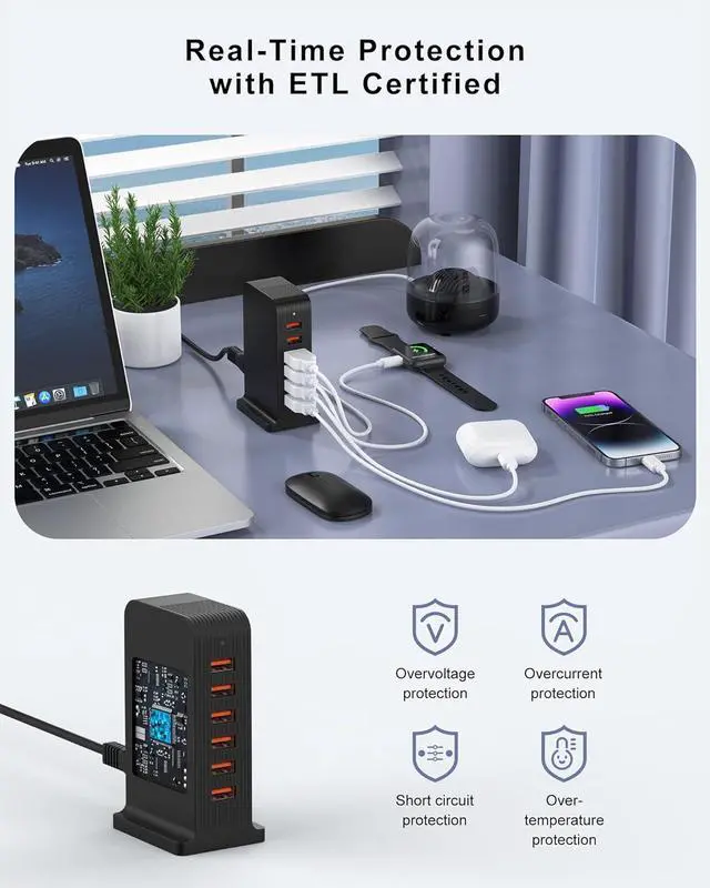 ETL Certified for Safety and ReliabilityYour device's safety is a priority. This charging station is ETL Certified, complying with Canadian safety standards. It features a built-in multi-protection system that safeguards against over-voltage, over-current, overheating, and short-circuiting, protecting your valuable electronics during charging.