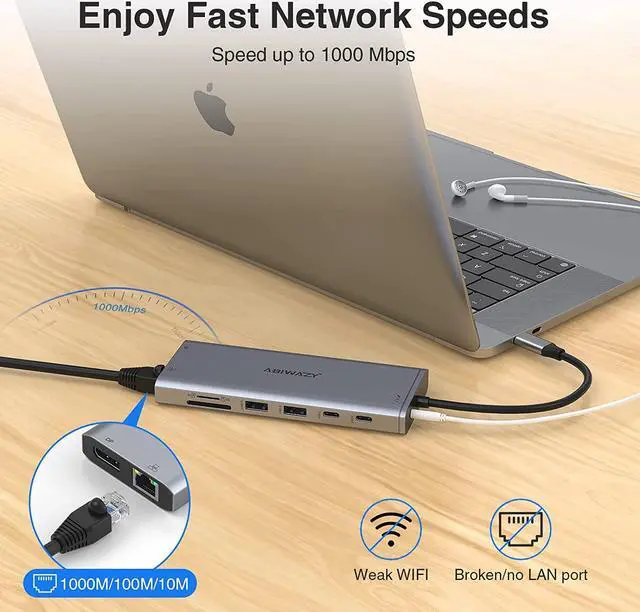 Adapter USB C to Gigabit Ethernet & Mic/Audio: The Docking station supports 10/100/1000BASE-T Lan networks, just enjoy the ultra-fast gigabite ethernet speed and the reliability of a wired connection directly. Also, this usb c dock has a 3.5 mm Mic/Audio (2 in 1) jack for you to put in your wired headset, so that you can enjoy music without disturbing others