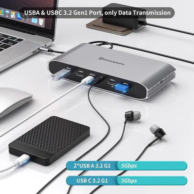 DisplayLink Docking Station: The Minisopuru displaylink dock with 36W power adapter expand 12 ports for daily use: 2*4K HDMI+ 2*4K displayport+2* 5Gbps USBA 3.2 Gen1 port (only data) + 5Gbps USB C 3.2 Gen1 port (only data) + 100W USB-C PD (Max) + 2*USBA 2.0 ports(data & charge)+ Gigabit Ethernet+ 3.5 mm audio/Mic jack.