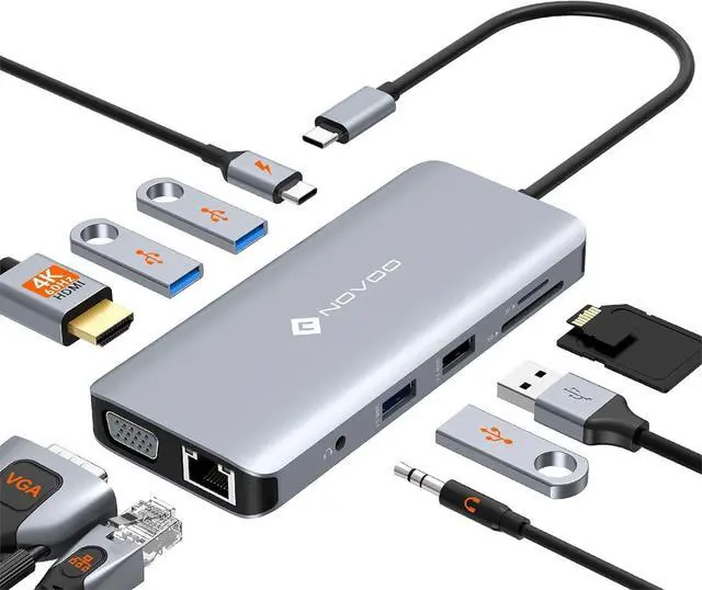 11-IN-1 USB C Docking StationElevate your workspace with this versatile 11-in-1 USB C docking station. Offering 4K@60Hz HDMI, RJ45 Gigagit EthernetVGA, 100W PD Charging Port, 4 USB Ports, SD/TF card readers, audio/mic jack, and SST Mode. The NOVOO Laptop USB C Docking Station is the perfect solution for a tidy and efficient desk setup.