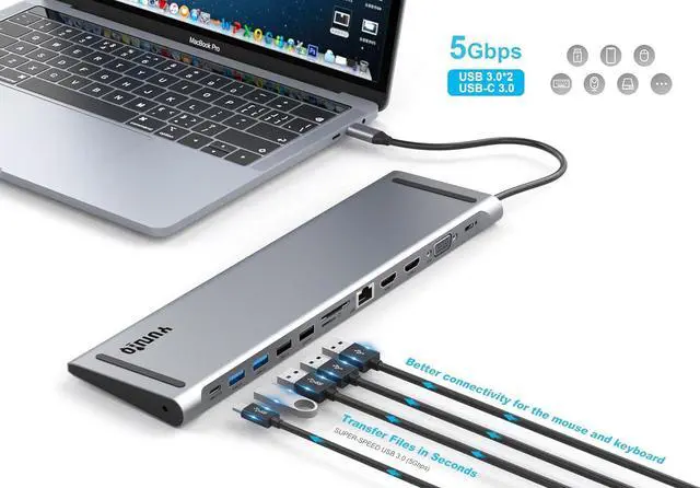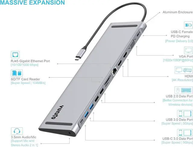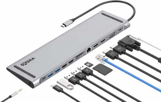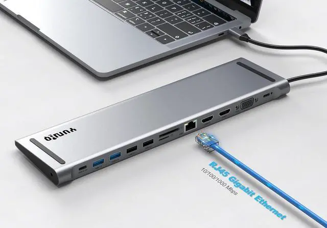 13-in-1 laptop features a massive expansion docking station, Simply plug in and operate. Gigabit Ethernet, 3.5 mm audio/mic, USB C PD, SD, TF card readers, 4K HDMI, USB 3.0 5Gbps, and USB 2.0 ports.