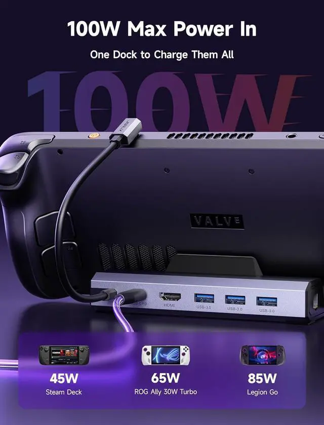 Note: This dock comes with a 65W PD charger, which provides stable power for Steam Deck, ROG Ally/Ally X, Legion Go/Go S, and MSI Claw in most scenarios. For extended sessions in 30W Turbo Mode with multiple peripherals connected, consider upgrading to a 100W PD charger for maximum performance.