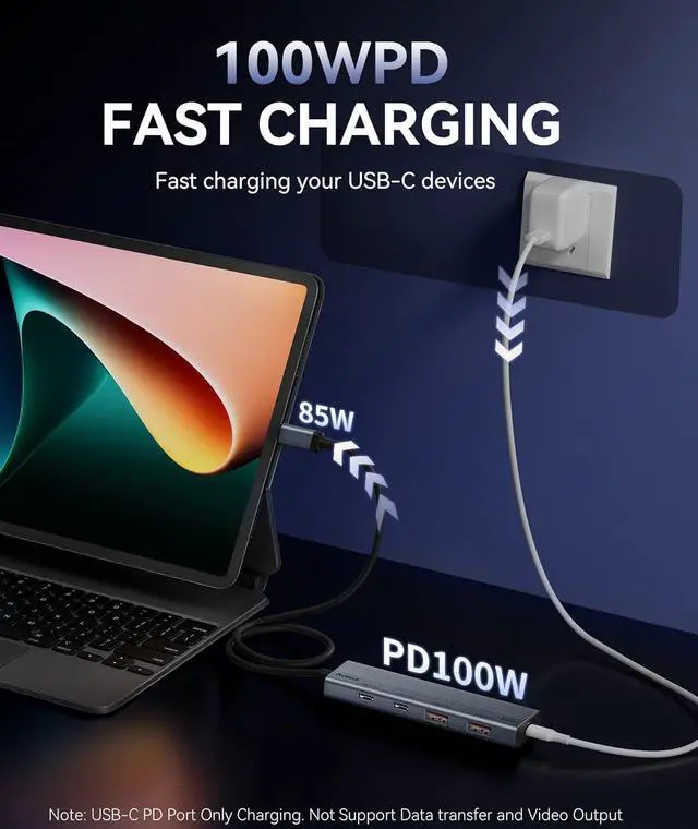 100W Pass-Through Charging: Equipped with a 100W USB-C PD port, this usb c 3.2 splitter will offer fast, efficient charging for your laptop at home, in the office, or on the go.