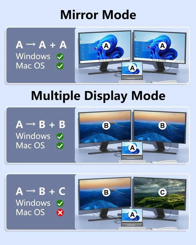 Mirror and Extend Mode: Multi monitor adapter for dual monitors can expand the laptop USB C port into 2 HDMI ports of 4K@30Hz. For Windows OS, it supports dual HDMI to display different screens; for Mac OS, Mac OS/iPad OS does not support MST technology (ABC Mode) and you will get 2 mirrored displays (ABB) instead of 2 independent displays (ABC) when used with Mac OS or ipad OS! Make sure your USB Type C port support DISPLAYPORT ALTERNATE MODE.