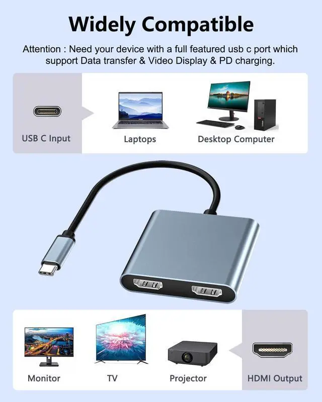 UHD Video Output: Dnkeaur 4-IN-1 USB C to dual hdmi adapter is equipped with dual 4K HDMI ports, PD, USB 3.0 port. Using 1 HDMI port of this 2 HDMI monitor adapter, the maximum resolution is up to 4K@30Hz, using the 2 HDMI ports of this dual monitor connector for laptop, the maximum resolution is up to 1080P. (Tips: Video output will be 4K if your device supports 4K resolution). As long there is a Thunderbolt 3/USB-C alt mode port available, you can easily extend laptop to two monitors.