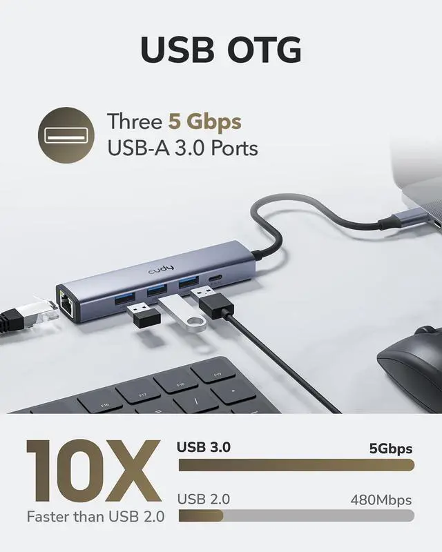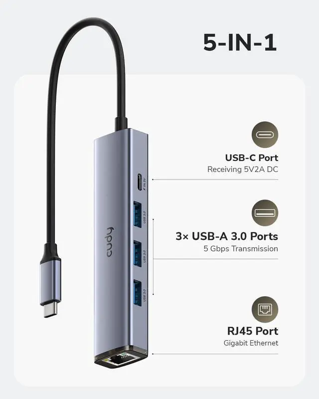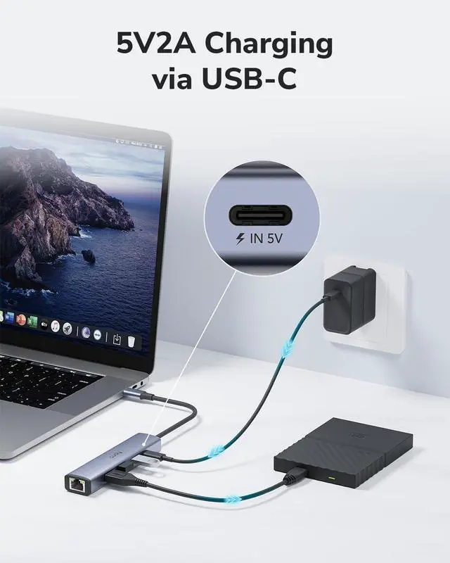Connectivity: 1× Upstream USB-A Male, 3× USB-A 3.2 Gen 1, 1× Gigabit Ethernet RJ45 Port, 1× USB-C Port Receiving 5V2A DC
