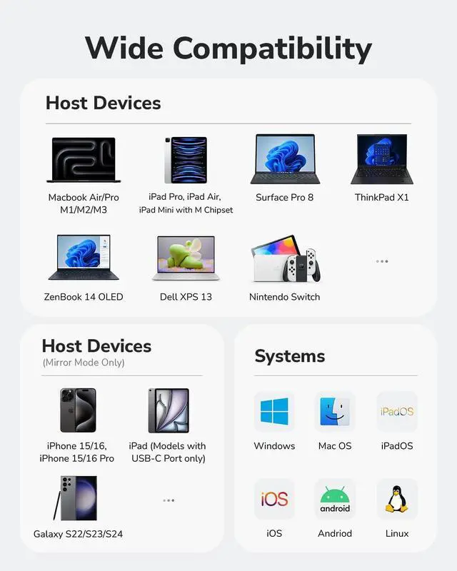 Wide Compatibility: The USB C docking station is compatible with almost all USB-C devices, such as MacBook iPhone 15/16/17, Mac, iPad, Galaxy, Chromebook, Surface, XPS, ThinkPad, etc.