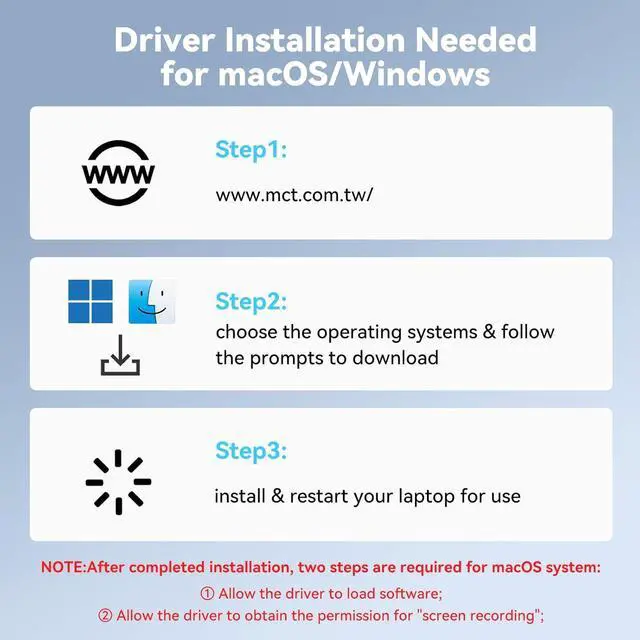 Driver installation is required - Support macOS or newer, Windows 11, 10, 7, 8.1, Note: iOS, Linux, Unix Android are not supported