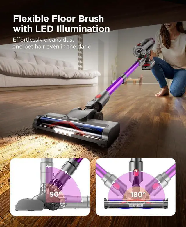 LED Flex Head Precision Cleaning in Dark CornersSee & clean hidden dirt. The LED brush head illuminates dust in dark areas, making it effortless to clean under furniture, along baseboards, and tight corners.