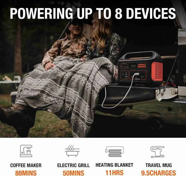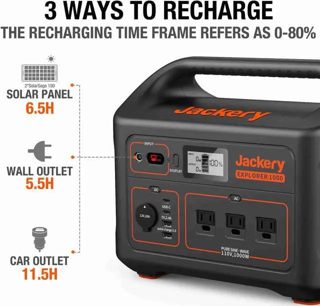 Jackery Explorer 1000 Portable Power Station charges eight devices simultaneously. Featuring a battery capacity of 1002Wh, the portable power station is suitable for charging all devices during camping and power outages. Excellent features of the Explorer 1000 power station include three standard pure sine wave AC outlets, a compact design, an MPPT charge controller, and an industrial-grade quiet power station.