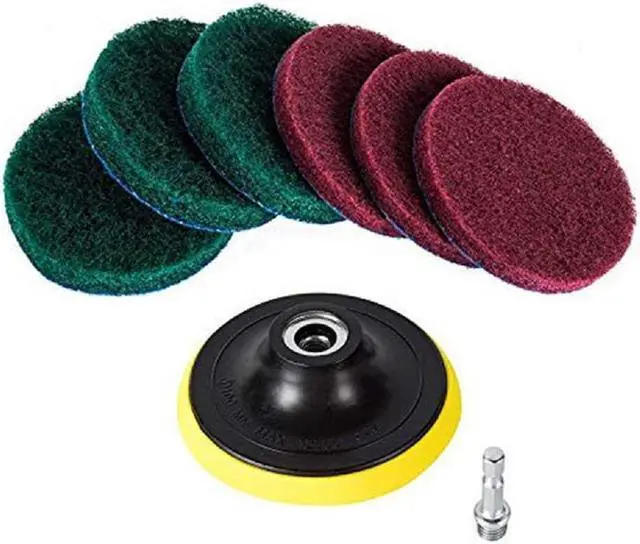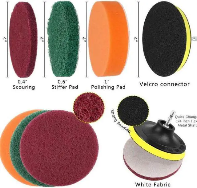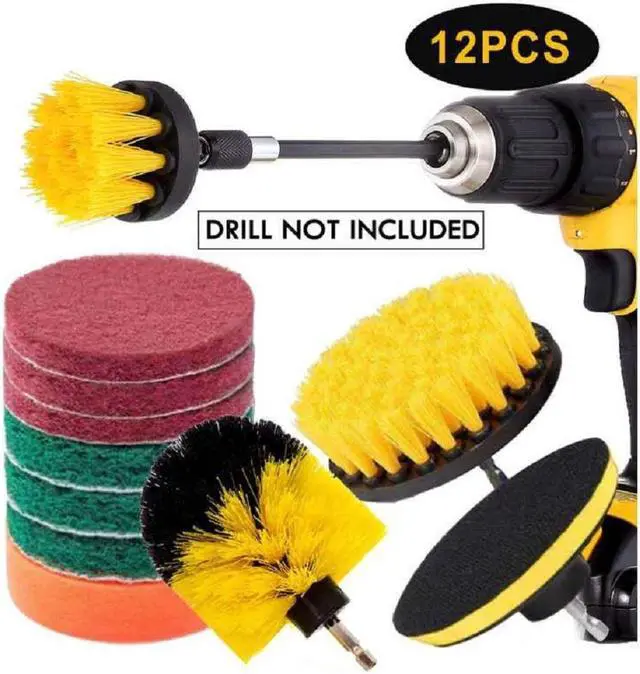 12 pieces drill scrubber brush set includes different sizes and shapes and an extended attachment, 4" flat brush designed for flat surface scrubber such as floors, carpets cleaning. 3.5" round head brush designed for rounded corners as bathtub, sink, car tires cleaning. 2" little brush designed for the triangle area as grills, cooktop, range hood cleaning. The edge brush designed for cleaning the floor joint, window, and sliding door track. The 6" extended attachment can be tightly locked into the drill, allowing you to get into tight spaces and hard-to-reach areas to achieve thorough clean. 1/4" diameter quick-change shaft is compatible with all our brushes, and also with most cordless drills.