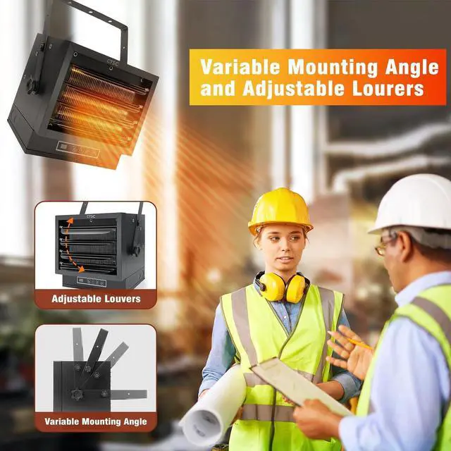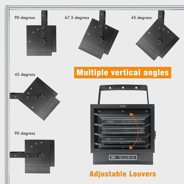 Adjustable Angle & Easy to Install - Our electric garage heater have adjustable angles for horizontal and vertical mounting bracket with safety lock, and adjustable panels for precise airflow direction. The package come with mounting bracket, screw and washer, installation was pretty easy.
