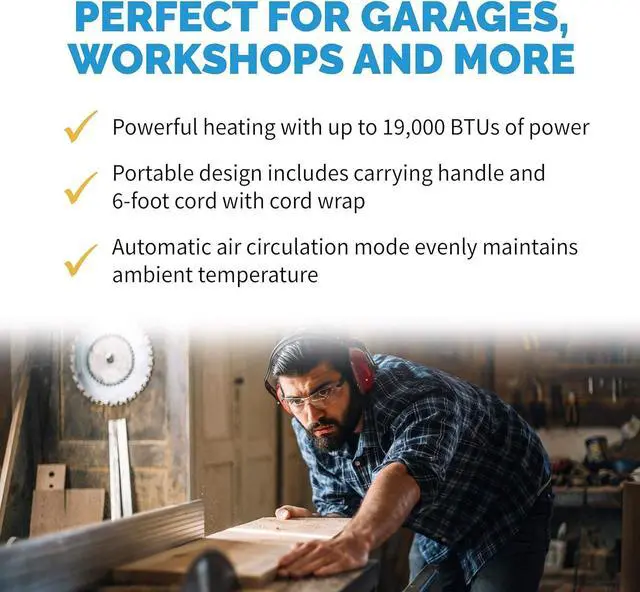 [PORTABILITY FEATURES FOR FAR-RANGING HEAT] - Take advantage of 2 portable features: the cord wrap and carry handle. Together they make it easy for you to position or move your heater to the most ideal place in your garage, workshop, or shed.
