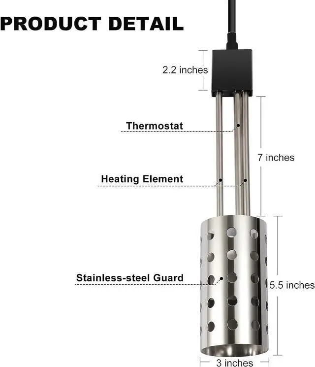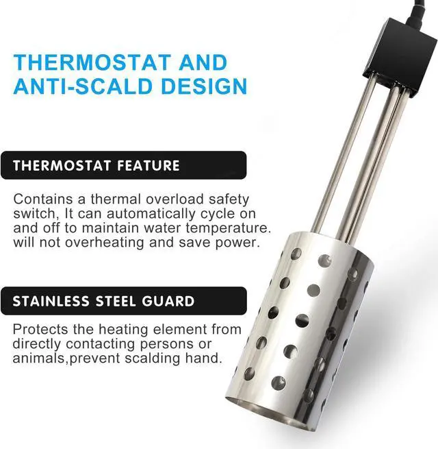 hermostat Feature: The middle stainless steel tube contains a thermal overload safety switch, when water reaches about 180 degrees F, it can automatically cycle on and off to maintain water temperature. It will not overheating and save power.