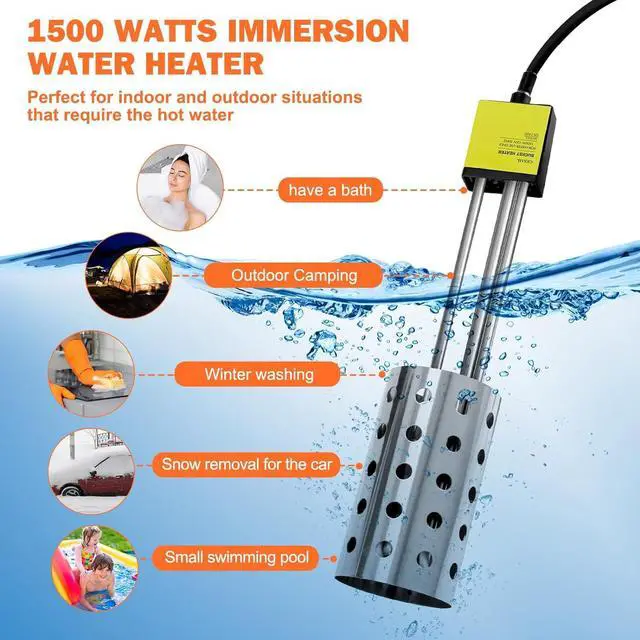 Heat Water Faster: 1500W, 120V immersion water heater, heats 5 gallons of water to 113 degrees F in 10 minutes approximately, water heater electric will heat water continuously over 180 degrees F and towards boiling.
