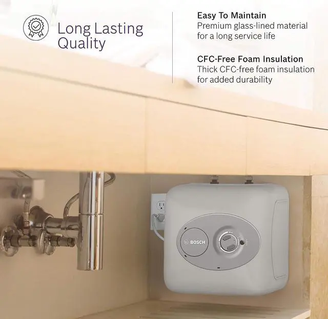 CONVENIENT HOT WATER HEATER: 4 gallon point-of-use mini-tank fits under your sink to provide hot water right where you need it. Thermal efficiency is 98%.