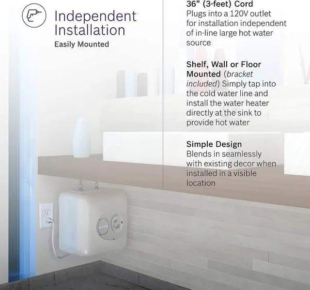 EASILY MOUNTED: Can be shelf, wall or floor mounted (bracket included); simply tap into the cold water line and install the water heater directly at the sink to provide hot water