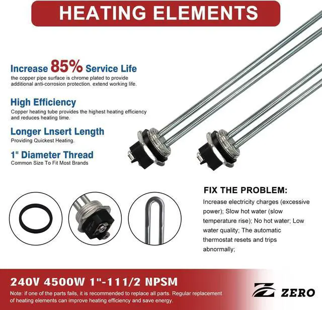 ONE YEAR WARRANTYInclude (2) 4500W 240V COPPER Water Heater Element, Insert