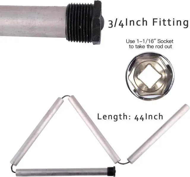 KIT INCLUDED: 1) 44 Inch-long magnesium rod, 3/4 NPT Thread makes it compatible with most water heater. 2) 1-1/16" Hex Socket Tool, help you to replace the anode rod. 3) Teflon Sealing Tape.