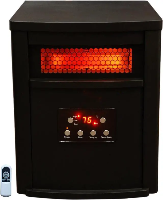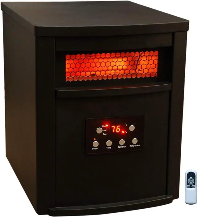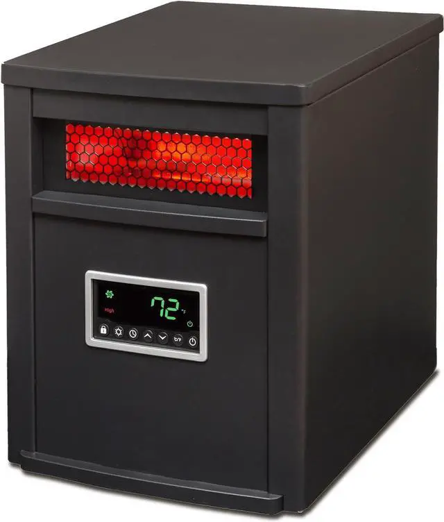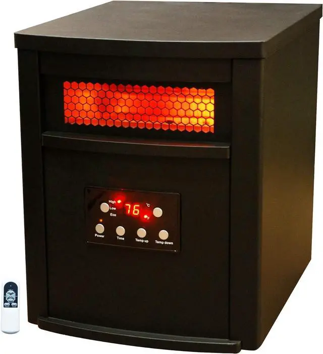 Provides Infrared Warmth to a Large Room 3 Heat Settings Including 500 Watt Eco Setting 12 Hour Start and Stop Timer Stylish Metal Cabinet Digital Thermostat with Remote Quiet Scroll Fan Circulates Heat Lifetime Air Filter