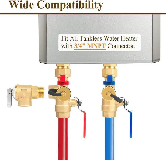 Compatibility Fit electric and gas tankless water heaters with 3/4" MNPT connectors, including Rinnai, Rheem, Navien, Ecosmart, and more.