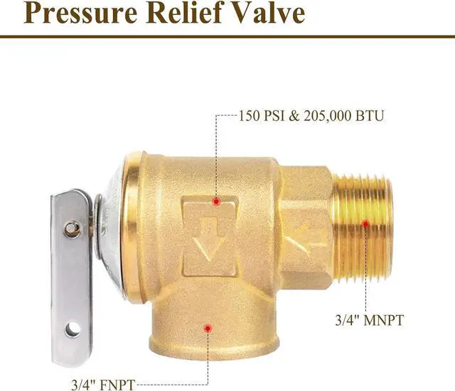 Pressure Relief Valve Installed on the hot water valve, it protects the water heater from exploding due to high pressure and can withstand up to 150 PSI.