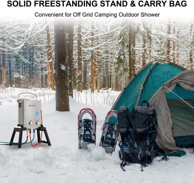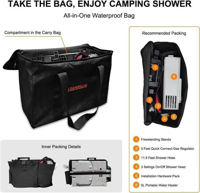 Super Portable & Compact. The portable water heater with portable handle, carry bag and solid freestanding stand, you can set it up just about anywhere. You can put all staffs in the supplied waterproof carry bag, making it much more easier to move around and fit in with all other camping gear