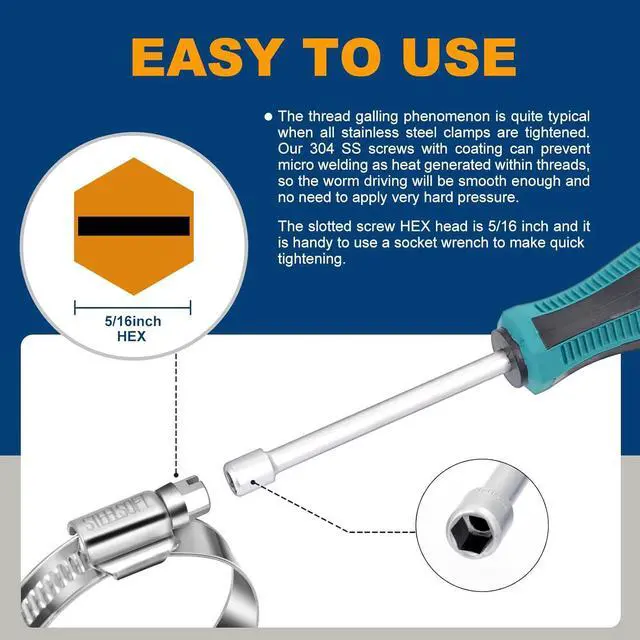 Non-Metric Sizes: Compared with other metric size adjustable hose clamps, our hose clips were engraved clear 5/8 to 1-1/16 inch on band for easy and fast identification when using. The slotted screw hex head is 5/16 inch.