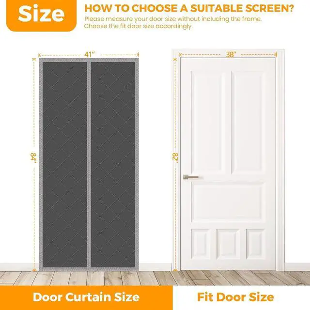 Magnetic thermal insulated curtain size: 41" x 84", compatibility with the door sizes of 38" x 82". It can be attached using Velcro-like strips and includes extra push pins for added security and strength. It's essential to measure your door before purchasing to ensure proper fit.