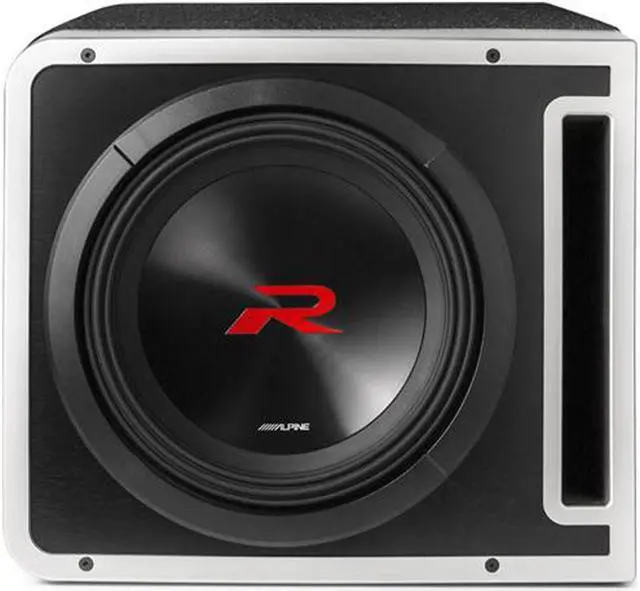 Driver: The Alpine R2-SB12V loaded enclosure features a single R2-W12D4 12, dual 4 voice coil subwoofer driver. The next generation R-Series driver features a Kevlar-reinforced pulp cone with a polypropylene/ceramic composite dust cap and a High-Amplitude Multi-Roll (H. A. M. R. ) surround. The driver also features two large double-stacked strontium-ferrite magnets for increased motor strength and excursion. A custom-designed cast aluminum frame and a dual-flare pole vent optimize airflow for driver cooling. Both 4 voice coils are wired in parallel for a single 2 connection.