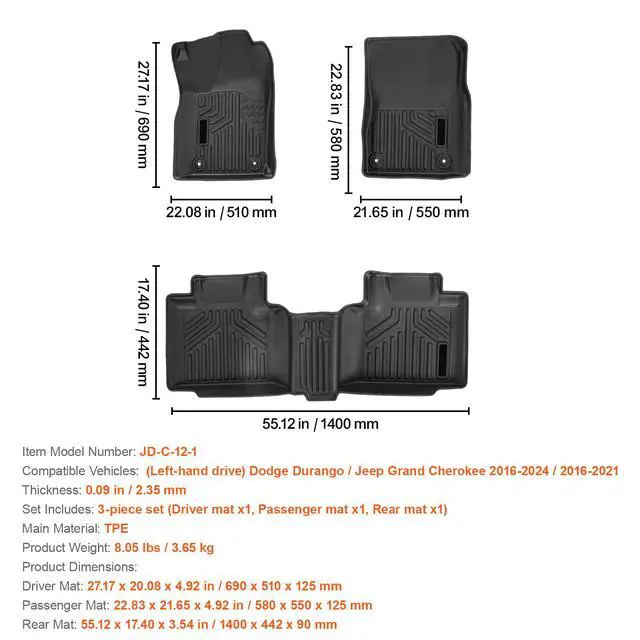 Set Includes: 3-piece set (Driver mat x1, Passenger mat x1, Rear mat x1)