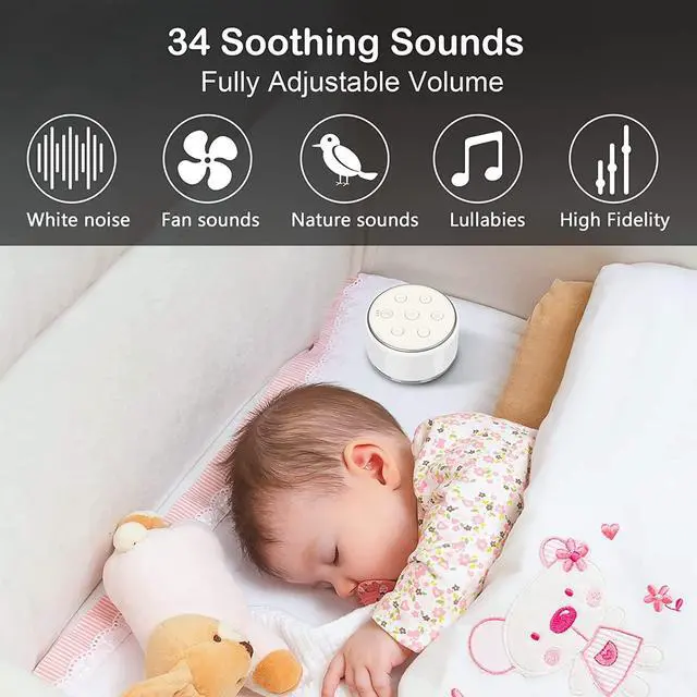 34 NON-LOOPING SOOTHING BACKGROUND SOUNDS from the Famisym Baby Sound Machine help your little cherub fall asleep faster and stay asleep longer. Our baby white noise machine helps recreate the womb-like environment that is free of disturbances from TV, barking dogs and rambunctious older siblings.