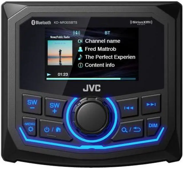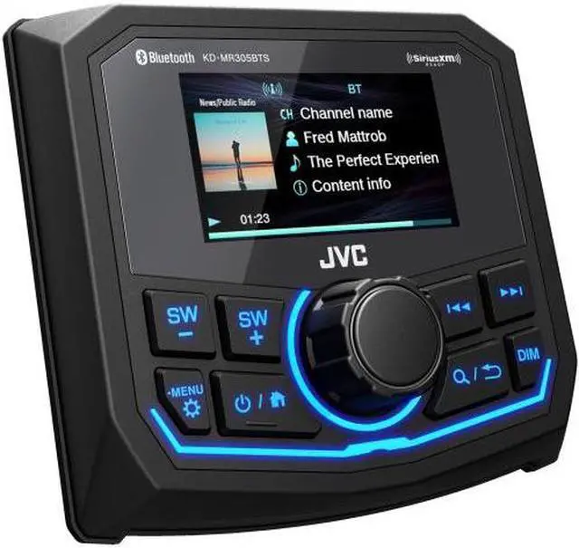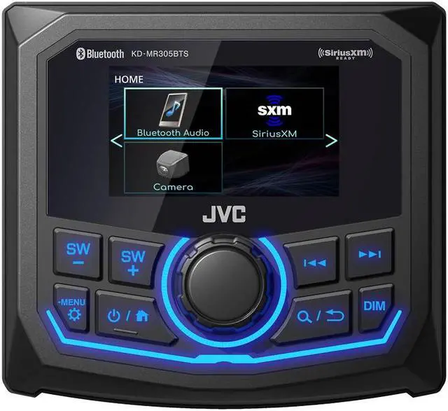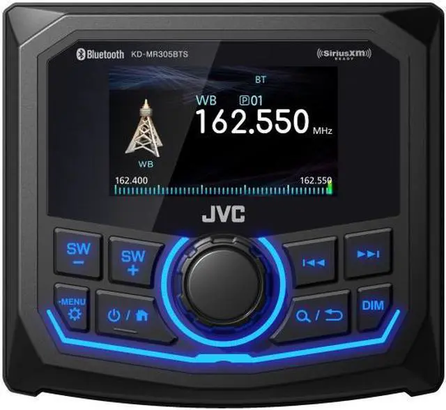 Have more fun in the sun with JVC's KD-MR305BTS marine digital media receiver. The bright 2.7" color display makes it easy to dial in AM/FM radio stations or weather band info on the radio's global tuner. JVC incorporates a USB input so you can access your favorite music files, while built-in Bluetooth lets you stream music from your smartphone. It'll all sound great, thanks to the 13-band EQ.