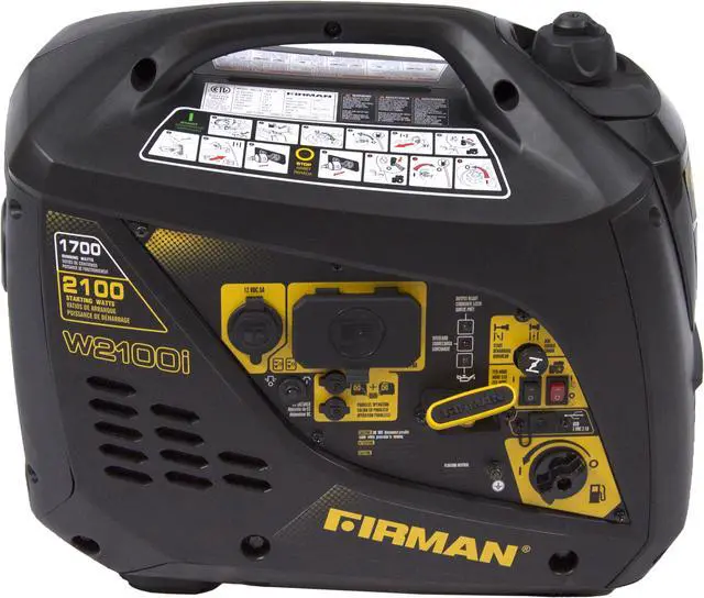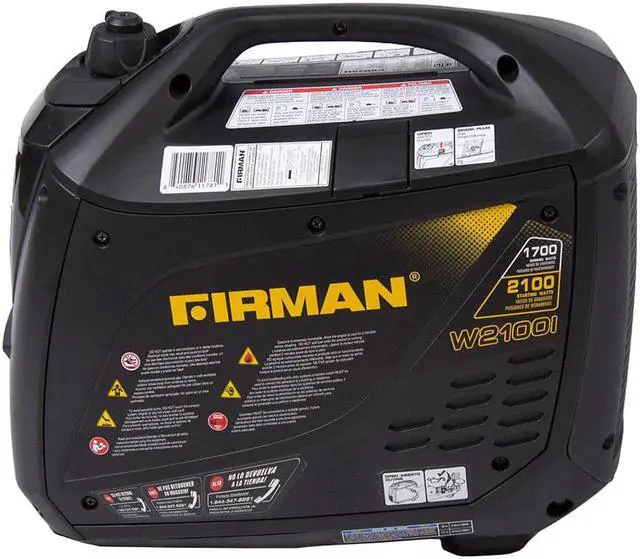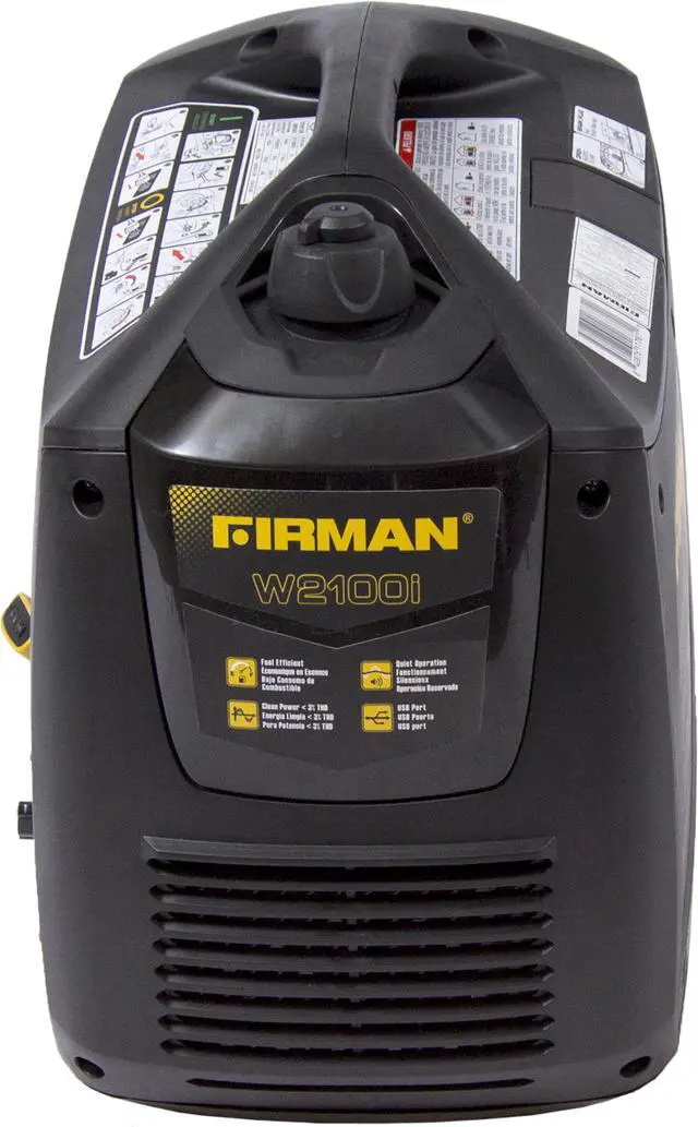 FIRMAN Whisper Series Inverter, Features:. 9 Gallon Fuel Tank Provides 10 Hour Run Time, One 5v, 2.1A mp USB Port, Fuel Efficient And Quiet Economy Mode, Volt Lock Automatic Voltage Regulator, Max Pro Series 80CC FIRMAN Engine, Legendary 3 Year Warranty, 54dB, Funnel And Manual, Durable Compact Design With Ergonomic Handle 2100 Starting Watts/1700 Running Watts Parallel Capable - Connect Any Two Size FIRMAN Inverters For Increased Power. 9 Gallon Fuel Tank 10 Hour Run Time Outlets - 2 120V 5-20 Duplex, 12V With Battery Charging Cables, USB (5V, 2.1A mp) Reliable Recoil Start Fuel Efficient Economy Mode Digital Automatic Voltage Regulator Power Stream Alternator Max Pro Series 80cc FIRMAN Engine Phoenix Fat Head Block For Enhanced Engine Efficiency Legendary 3 Year Warranty Whisper Series Muffler USDA Forest Service Approved Spark Arrestor Accessories Include Oil, Funnel And Manual Quiet And Lightweight - Only 54 Decibels and 44 Pounds