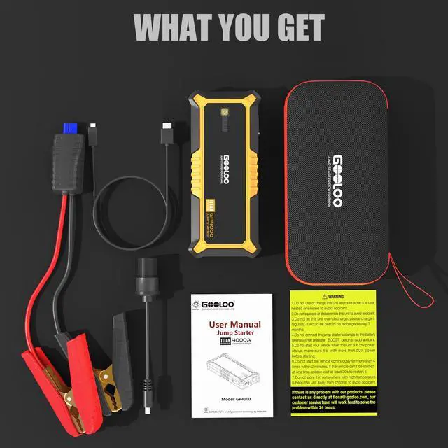 The GOOLOO GP4000 Smart Jumper Cable is constructed with all-metal clamps to prevent damage caused by long-term use. Rugged 12V Car Jump Starter - The hardened plastic and rubber corners make sure the starter can withstand drops without any problem. A built-in flashlight can assist you in vehicle emergencies at night. IN THE BOX - GOOLOO Heavy-Duty Portable Car Battery Jump Starter GP4000, Smart Jumper Cable, Wall Charger, USB to Type-C Cable, Storage Case, User Manual, Cigarette Lighter Adapter, 18 Months Warranty and Lifetime Tech Support.