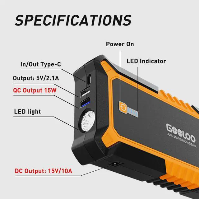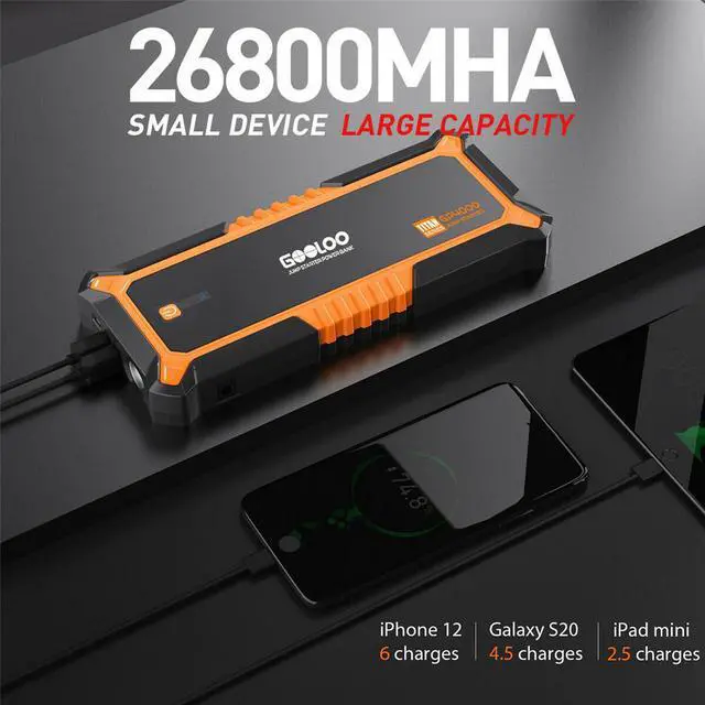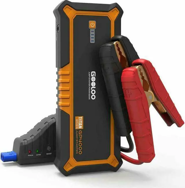 It can be taken anywhere and can quickly charge numerous portable devices, such as smartphones, tablets, cameras, GPS systems, and more. Emergency Life Saver The GOOLOO GP4000 portable car battery jump starter can jump start vehicles in a matter of seconds so that you arent stranded and unsafe for longer than needed. A full charge can boost most vehicles over 60 times! Safety & Quality Metal Clamps - Built-in 10 types of protection, free your worries of misuse and sparks. We wanted to make sure our users feel 100% safe when using our product.