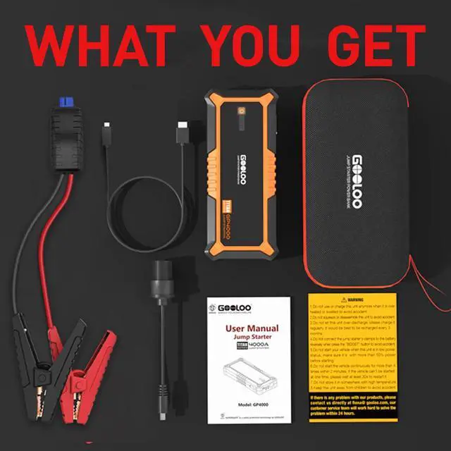 The GOOLOO GP4000 Smart Jumper Cable is constructed with all-metal clamps to prevent damage caused by long-term use. Rugged 12V Car Jump Starter - The hardened plastic and rubber corners make sure the starter can withstand drops without any problem. A built-in flashlight can assist you in vehicle emergencies at night. IN THE BOX - GOOLOO Heavy-Duty Portable Car Battery Jump Starter GP4000, Smart Jumper Cable, Wall Charger, USB to Type-C Cable, Storage Case, User Manual, Cigarette Lighter Adapter, 18 Months Warranty and Lifetime Tech Support.