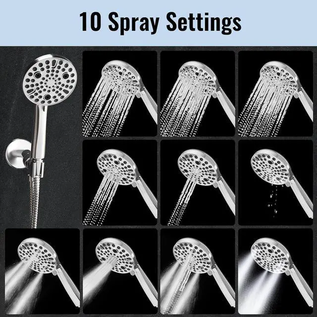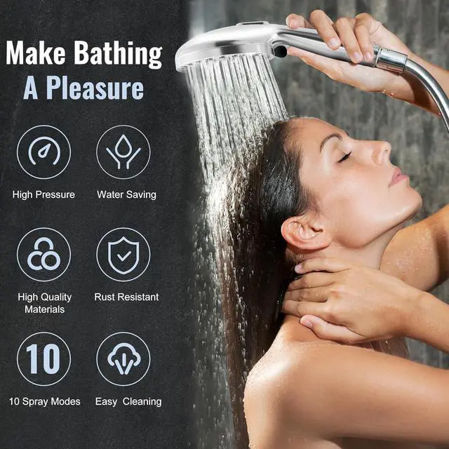 10-Spray Modes: Our high flow shower head meets the personal needs of the whole family. Whether it's a stimulating massage setting shower heads for your leg or a gentle spray for children&pets, you'll find the perfect mode for you.